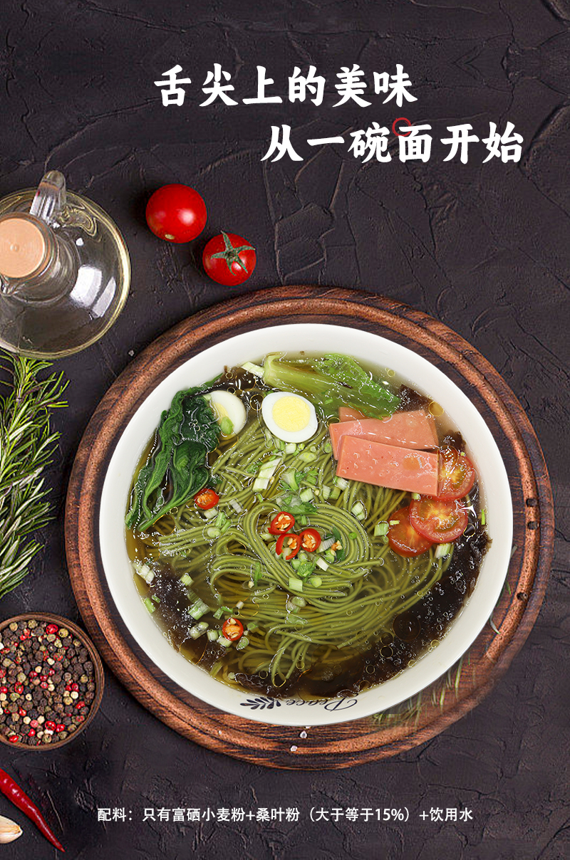 我们把‘长寿元素’硒和‘神仙叶’桑叶融进了面粉里,硒元素含量56%,煮出的面条绿莹莹的,口感柔韧,自带清香。它低脂又饱腹,尤其适合关注血糖和身材管理的朋友。