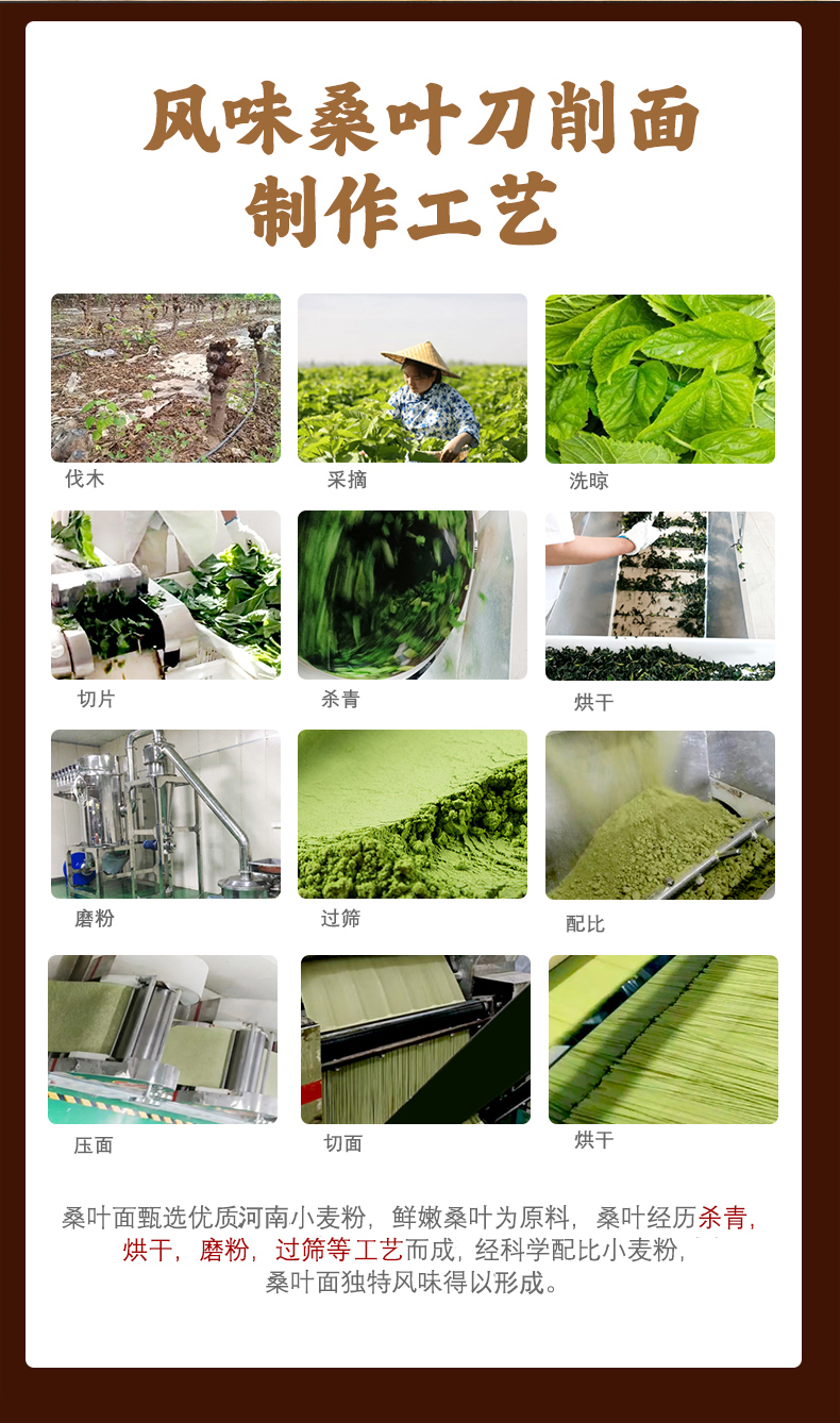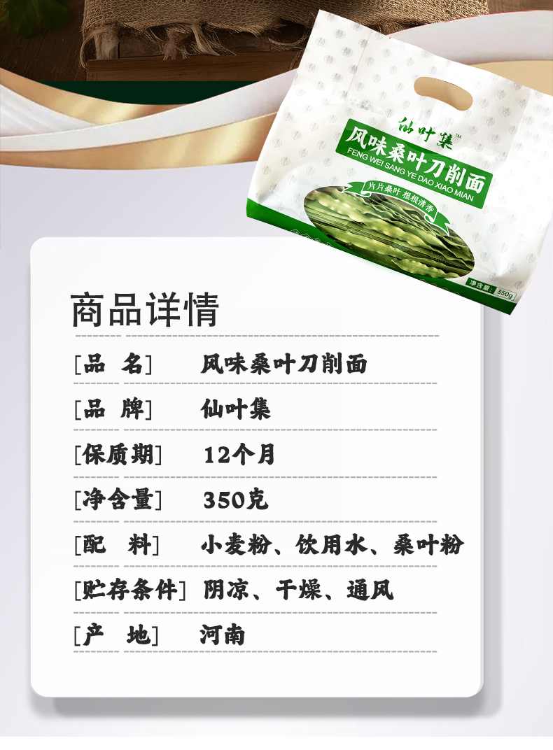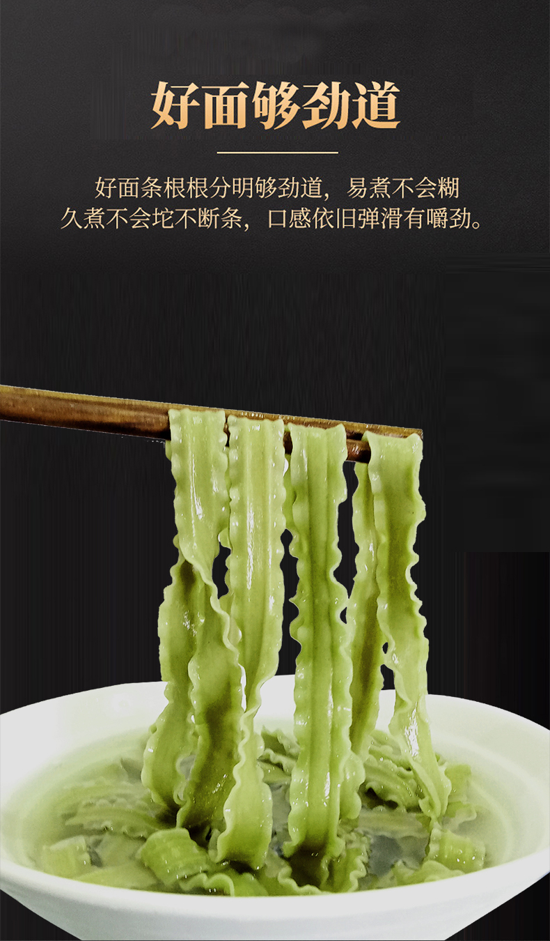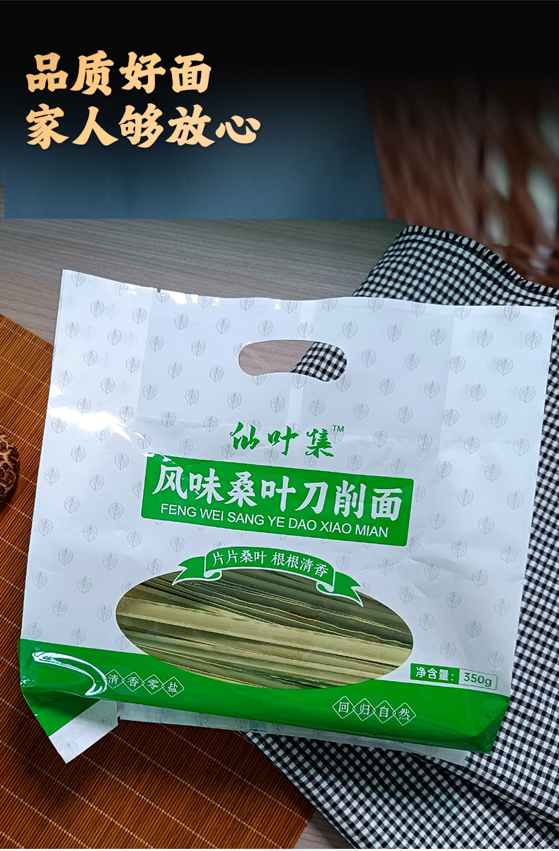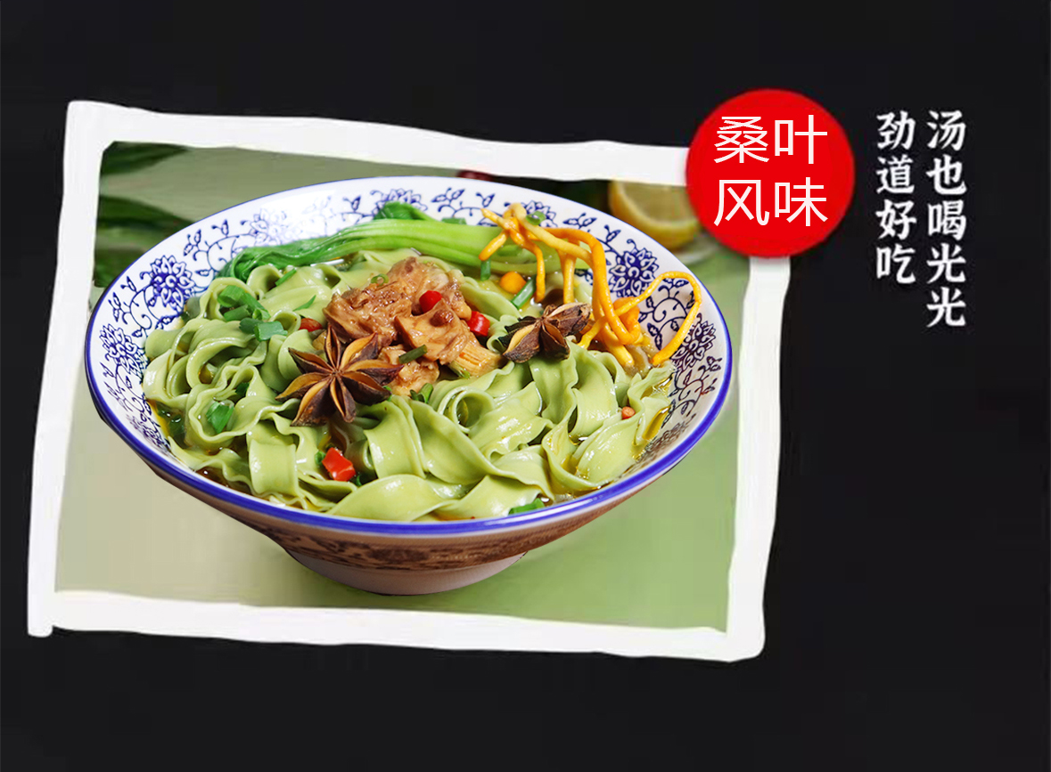 以人工选摘当地鲜嫩桑叶为原料,和特级一等小麦粉科学配比,经传统制面工艺制成,中宽边薄好入味,10mm宽波浪花边清晰可见,形似柳叶外滑内筋根根能挂汁,每一根面条色泽自然无黑点,汤色清透入口鲜香爽滑,面质筋道软而不粘越嚼越香,易煮不会糊,久煮不会坨、不断条。350g一袋