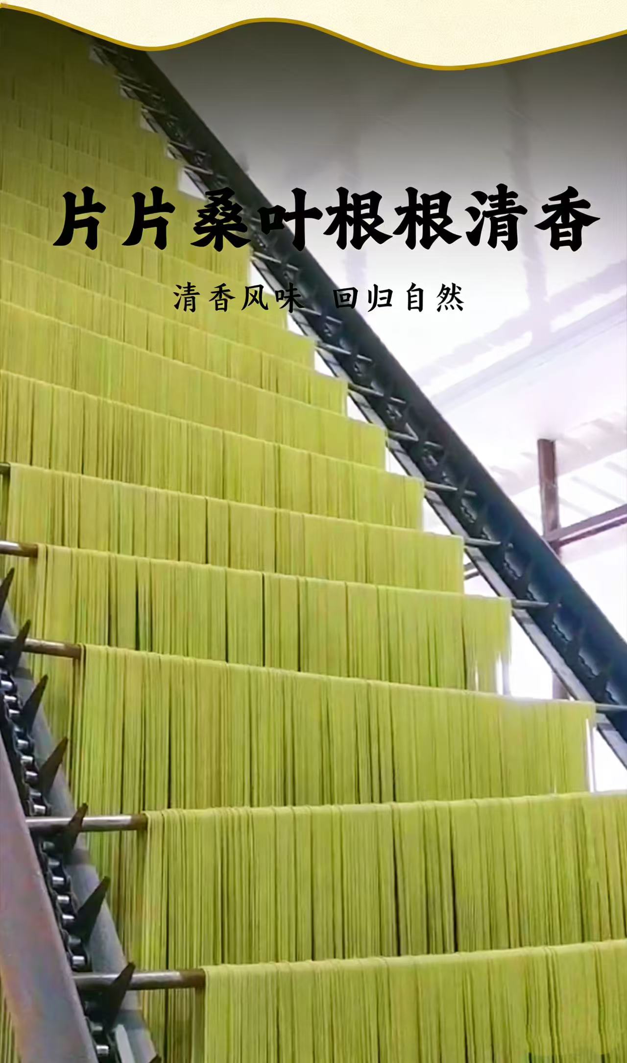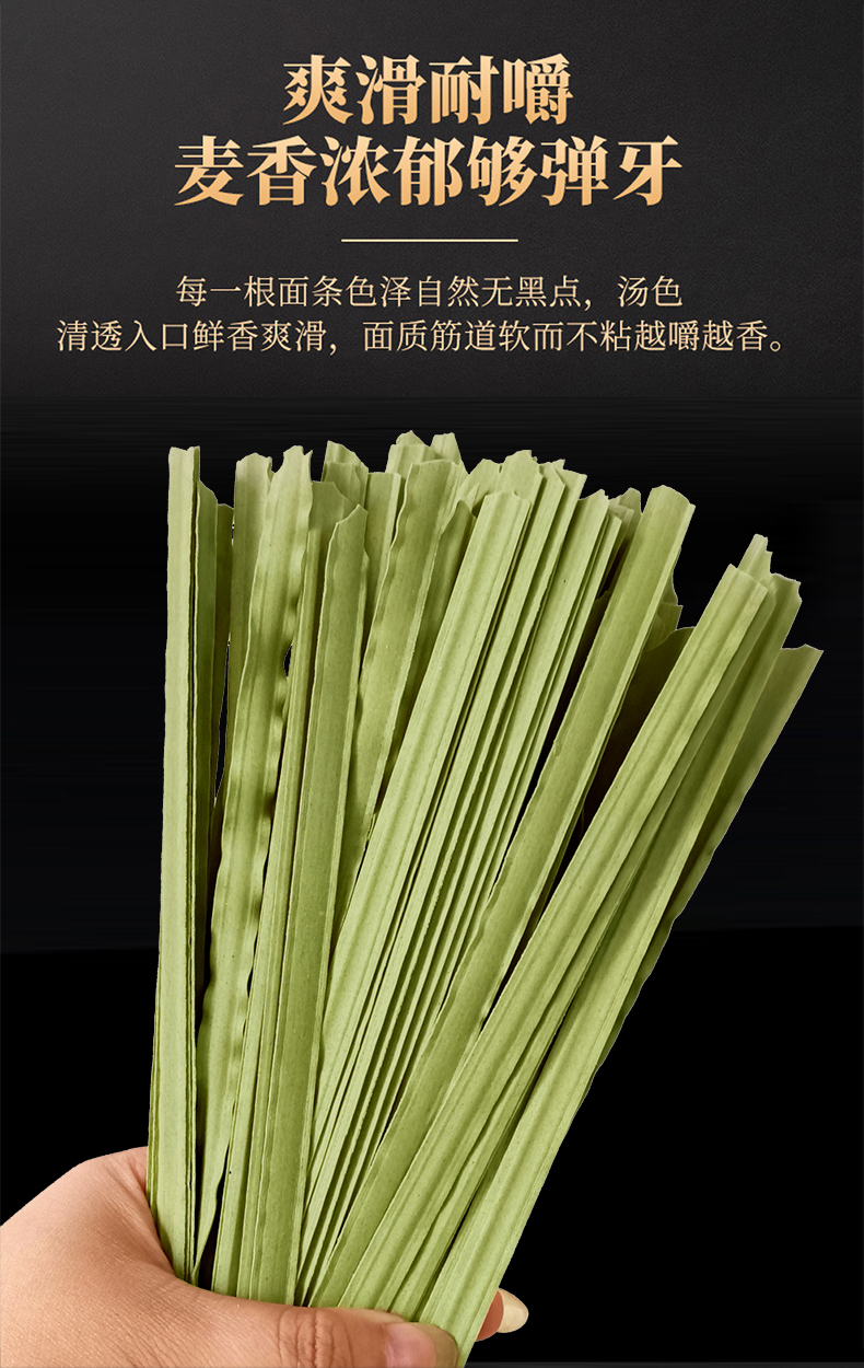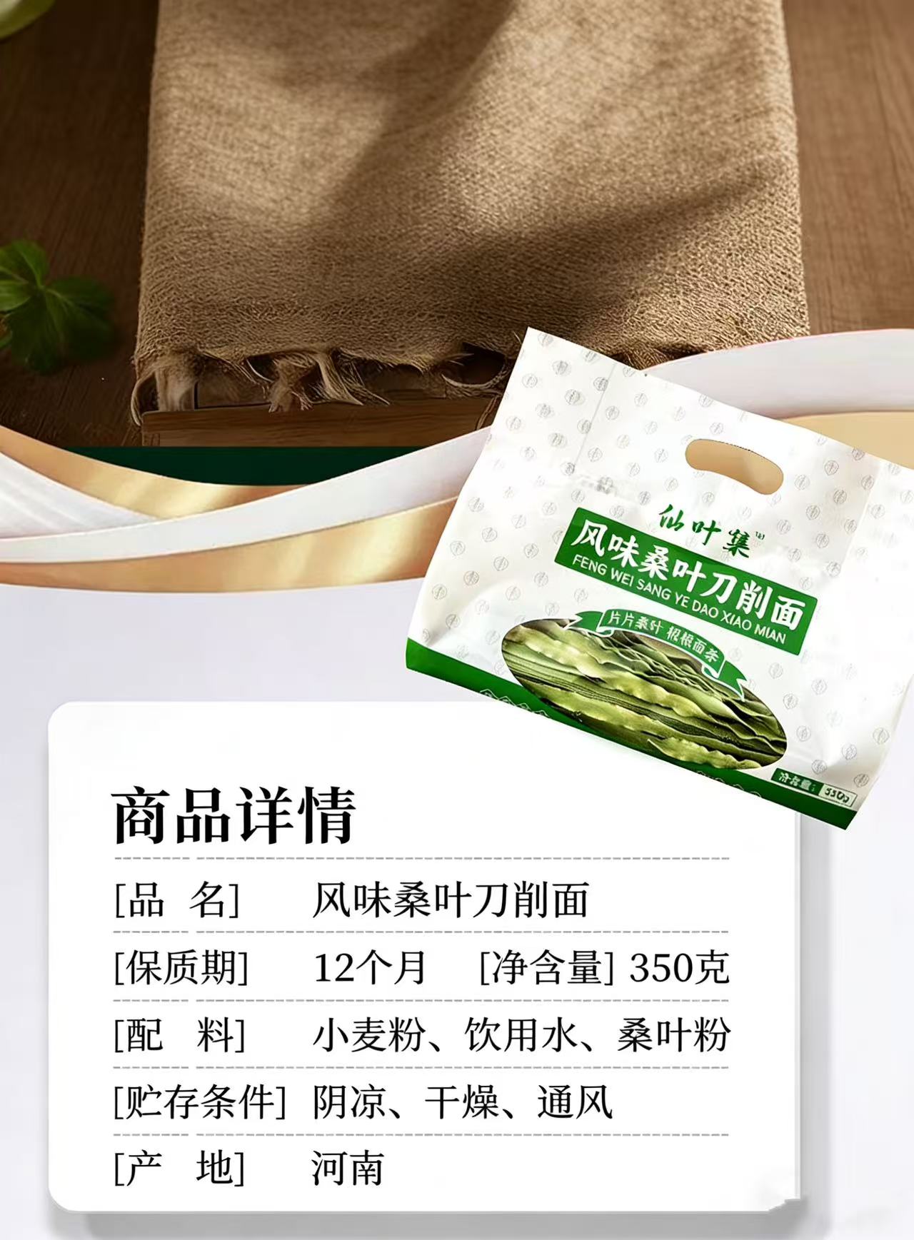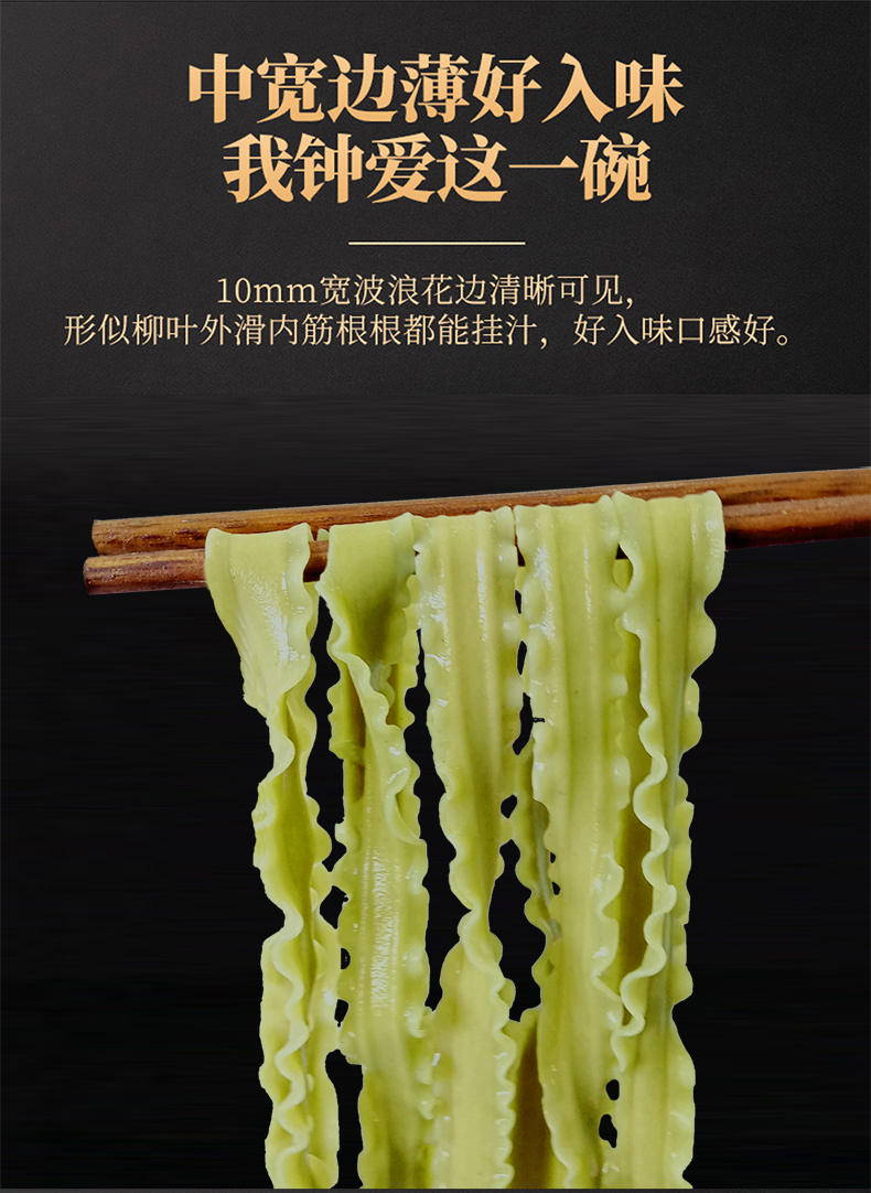 以人工选摘当地鲜嫩桑叶为原料,和特级一等小麦粉科学配比,经传统制面工艺制成,中宽边薄好入味,10mm宽波浪花边清晰可见,形似柳叶外滑内筋根根能挂汁,每一根面条色泽自然无黑点,汤色清透入口鲜香爽滑,面质筋道软而不粘越嚼越香,易煮不会糊,久煮不会坨、不断条。350g一袋