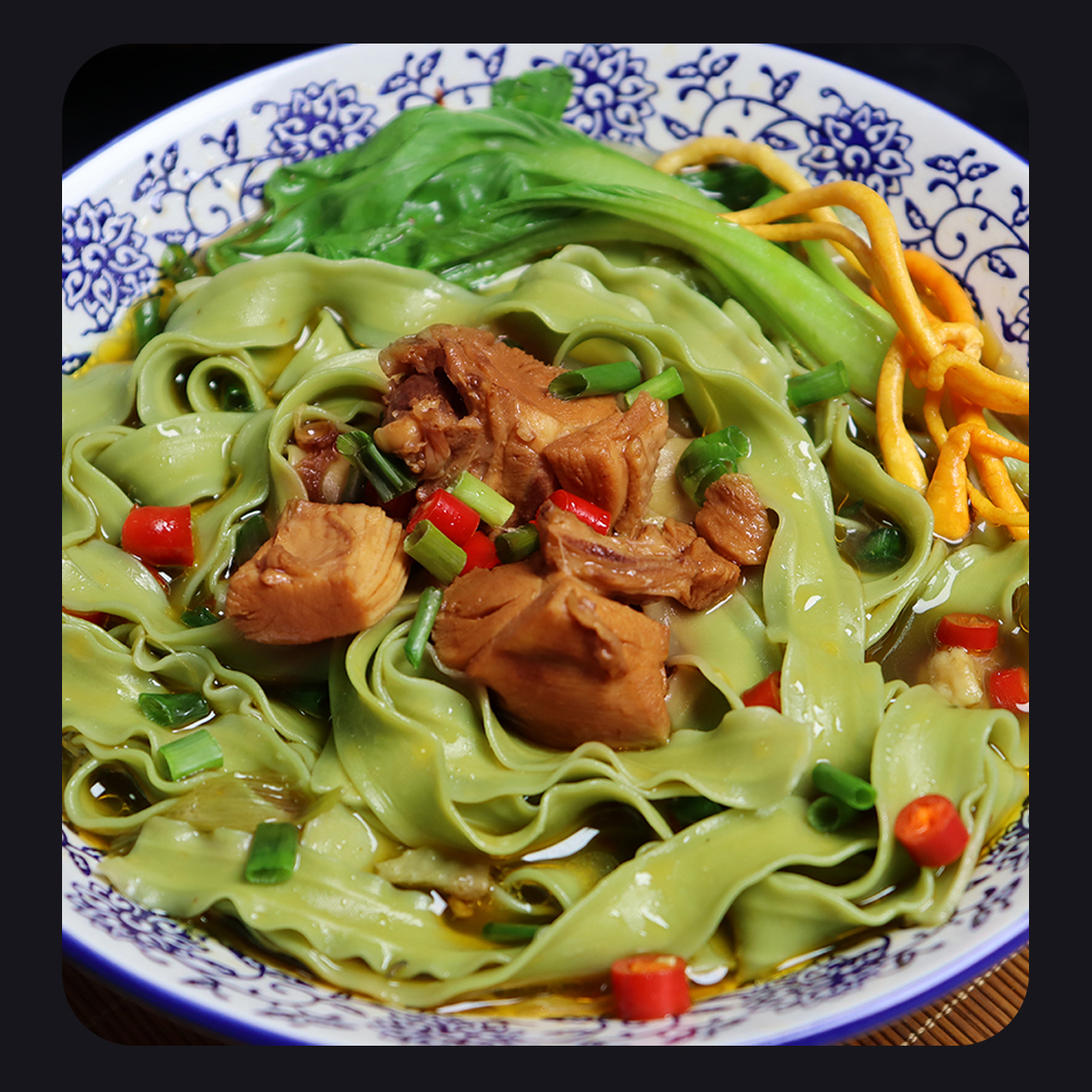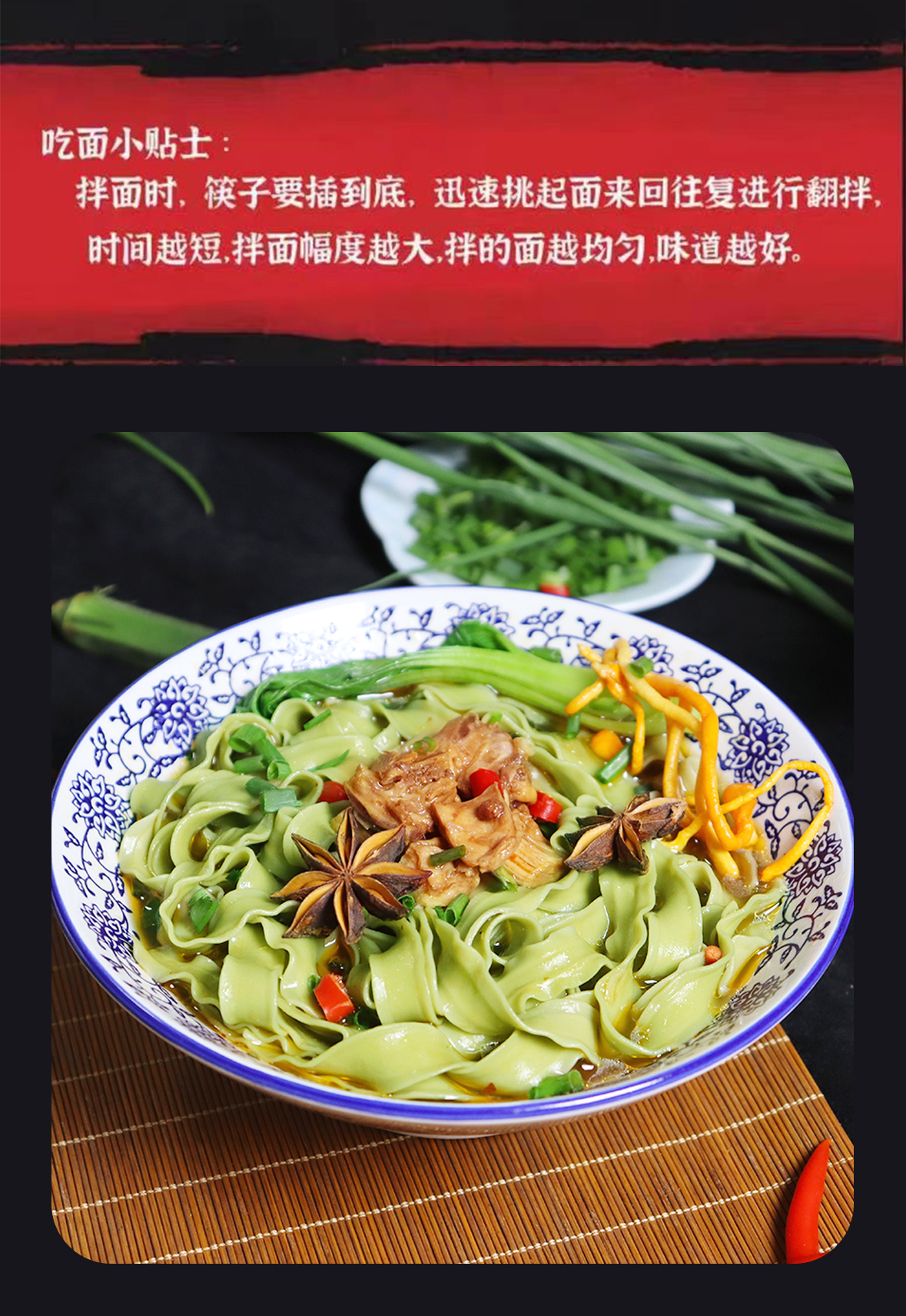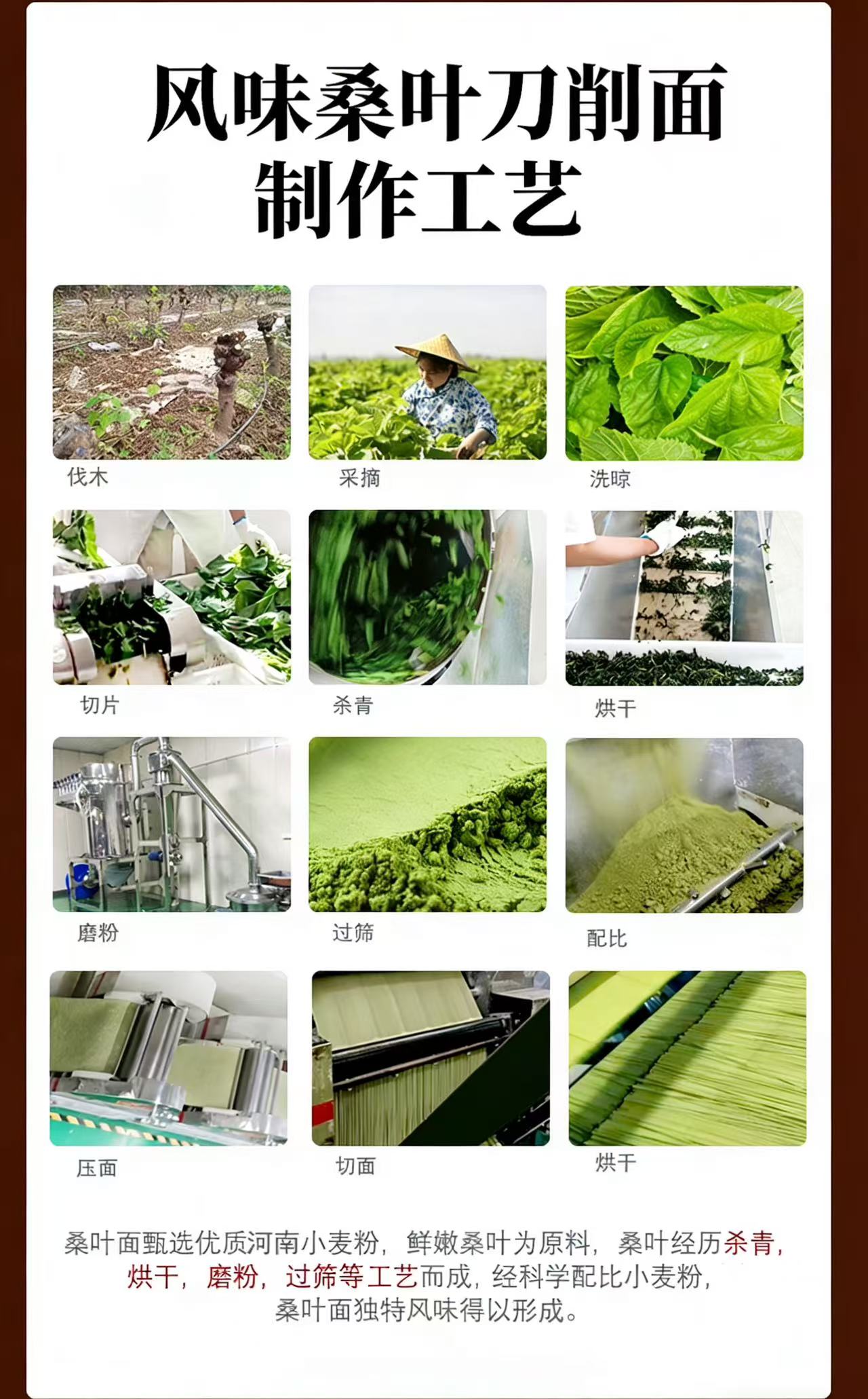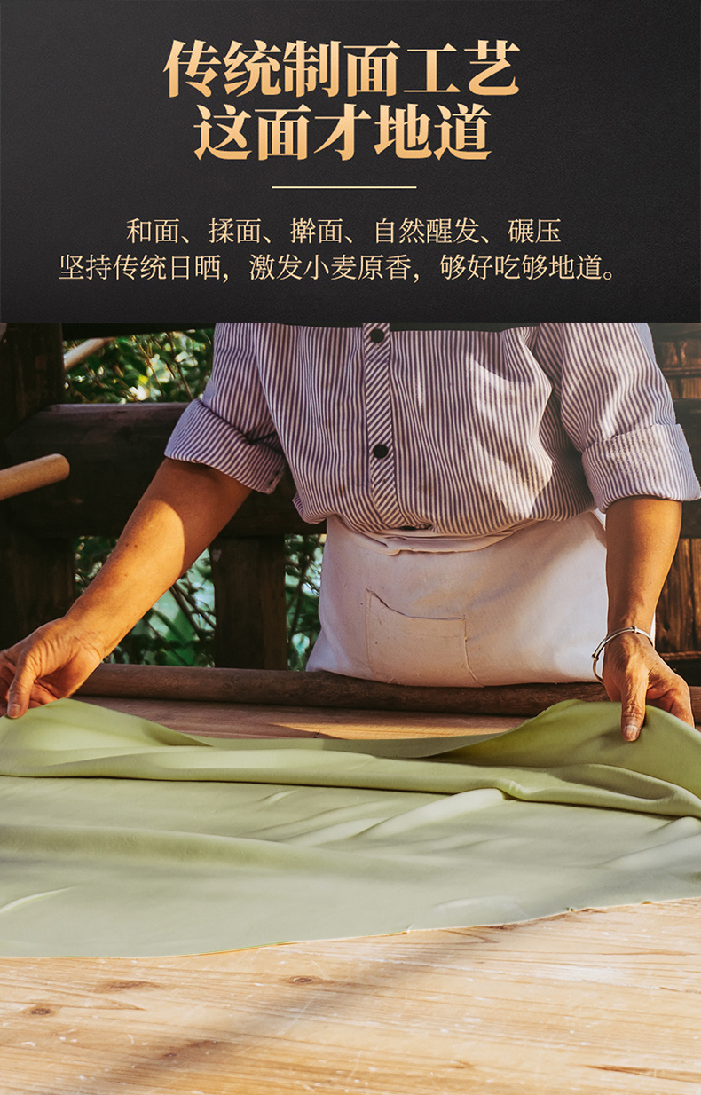 以人工选摘当地鲜嫩桑叶为原料,和特级一等小麦粉科学配比,经传统制面工艺制成,中宽边薄好入味,10mm宽波浪花边清晰可见,形似柳叶外滑内筋根根能挂汁,每一根面条色泽自然无黑点,汤色清透入口鲜香爽滑,面质筋道软而不粘越嚼越香,易煮不会糊,久煮不会坨、不断条。350g一袋